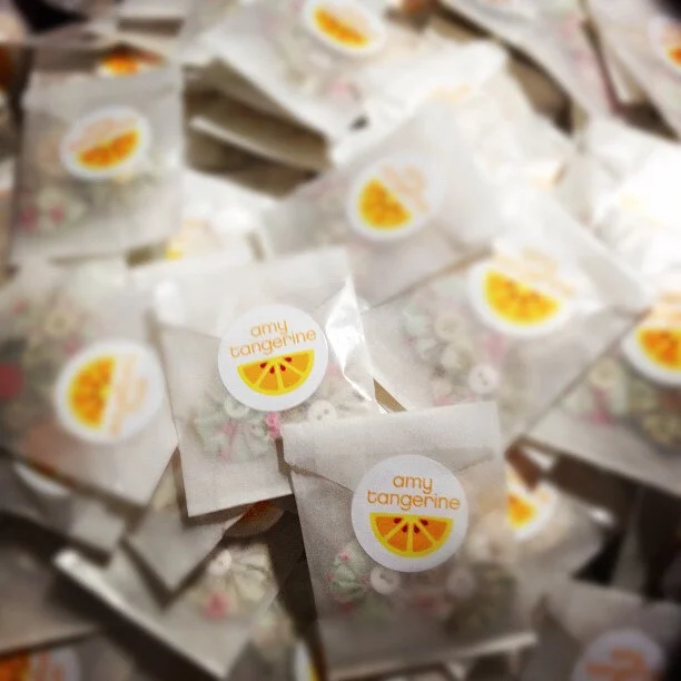 And now we can share what was in those little glassine envelopes galore. I snapped some photos of the process for the delightful little fabric flowers we made, also known as "yo-yo's".