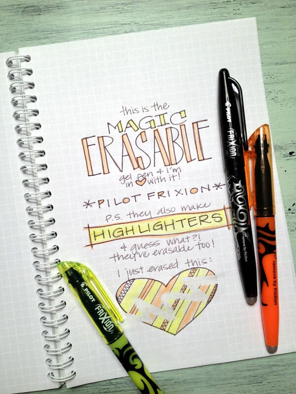 the paper with the months on it will be in the June Studio Calico kits While at Camp Calico last weekend, Kinsey brought a notebook full of amazing sketches. She didn't quite understand why we were going all crazy for her work, but believe me, it was all amazing. Her "rough" sketchbook of ideas rocked our world. Then she gave much of the credit to the pen that she uses. She swears by the Pilot FriXion Ball Erasable Gel Pens. And let me just tell you, after just seconds of scribbling, I was in love. Shanna and I ended up ordering a bunch immediately on our phones through the Amazon app. And apparently there are Pilot FriXion Colors Erasable Markers too! Crazy. Just so you have an idea of how amazing Kinsey's notebook is, she whipped this up quickly to demonstrate the Pilot FriXion Erasable Highlighters!