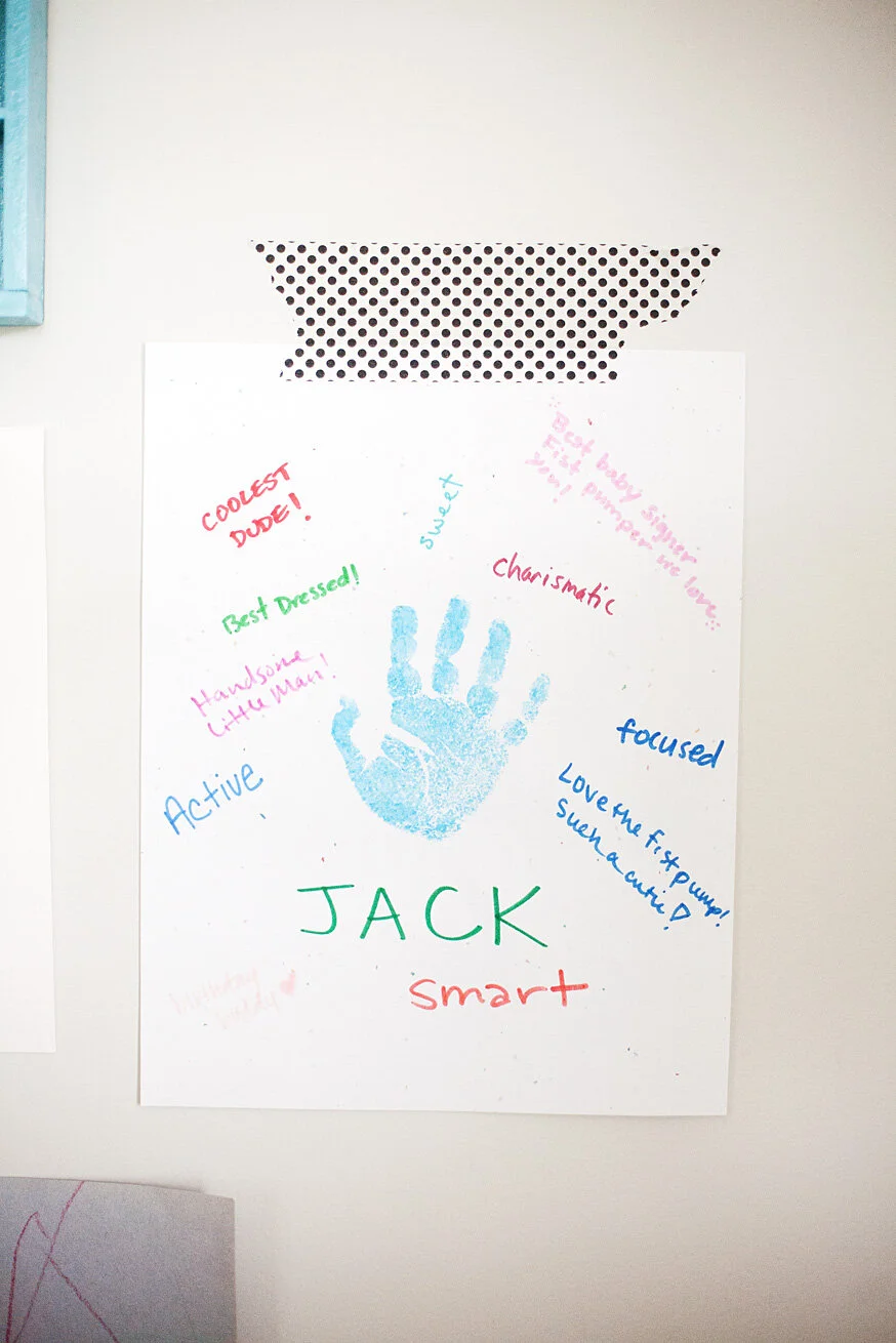 Jack "graduated" from mommy & me class! It was such a special year getting to know a dozen moms and their babies (all born in September/October 2013). For graduation, our teacher did hand prints of all the kids. Then mommies got a marker and we passed the pages around and wrote something on each child's print. Such a great idea, and now the work of art is hanging in Jack's playroom. I cherish it and smile each time I look at the words describing my little guy.