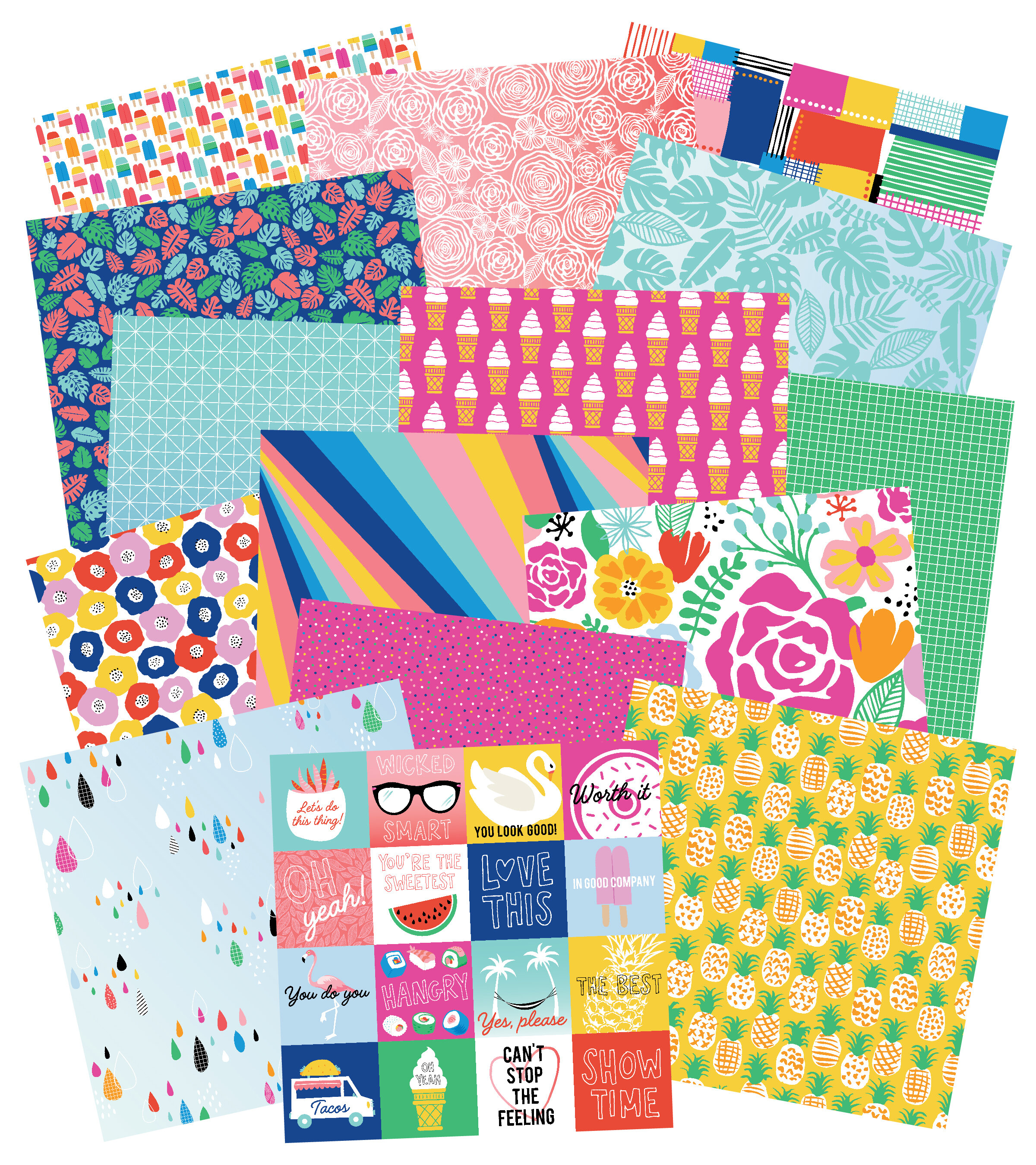 Capture spontaneity and fun times with On a Whim. Bold graphics and cool patterns complement fun phrases in a host of bright colors. Pineapple yellow, flamingo pink and ocean blue coordinate with accents of gold, green, and red. Document your favorite adventures with the cute icons of On a Whim!