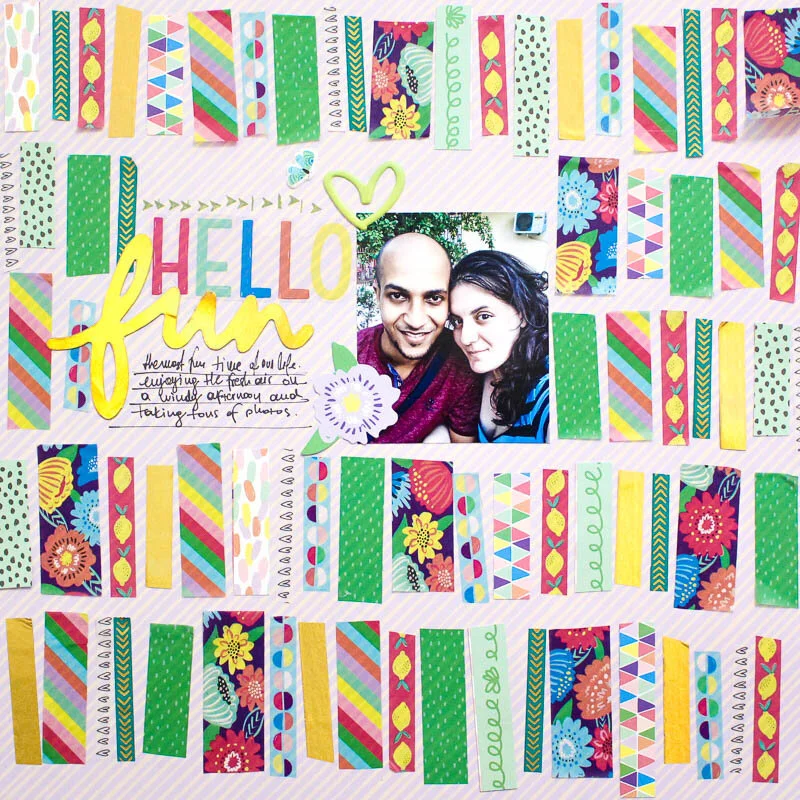 Hello everyone, it’s Zinia here and today I’d like to share with you a really fun way to use your washi tape stash to create a scrapbook layout…